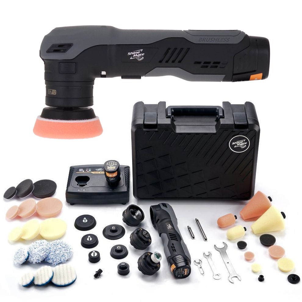 Paketti sisältää itse koneen, toimintopäät, kaksi 10,8 V / 2,5 Ah akkua ja kaksipaikkaisen laturin sekä erittäin laajan varustepaketin, jolla onnistuvat kaikki pienempää konetta tarvitsevat kiillotustyöt. Säilytyssalkku saranoidulla kannella sisältyy myös hintaan.
